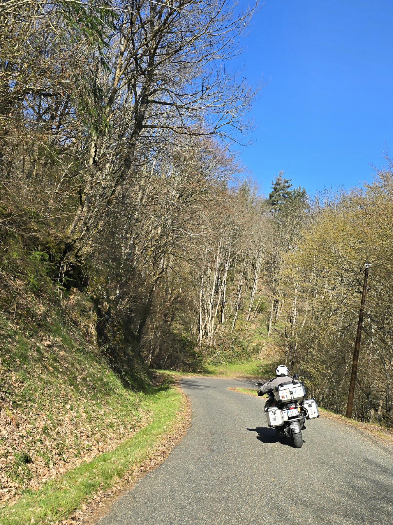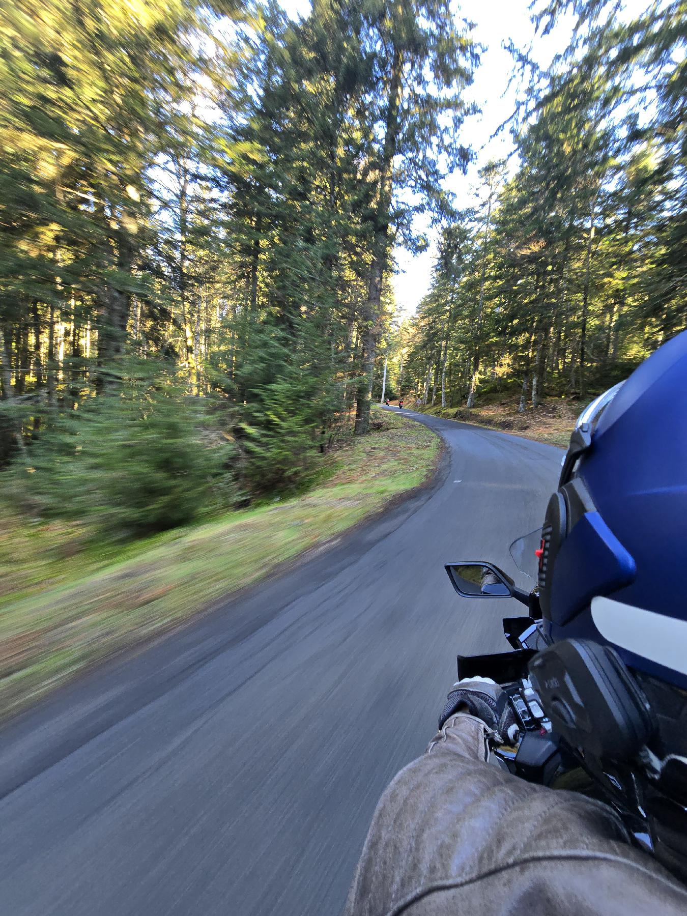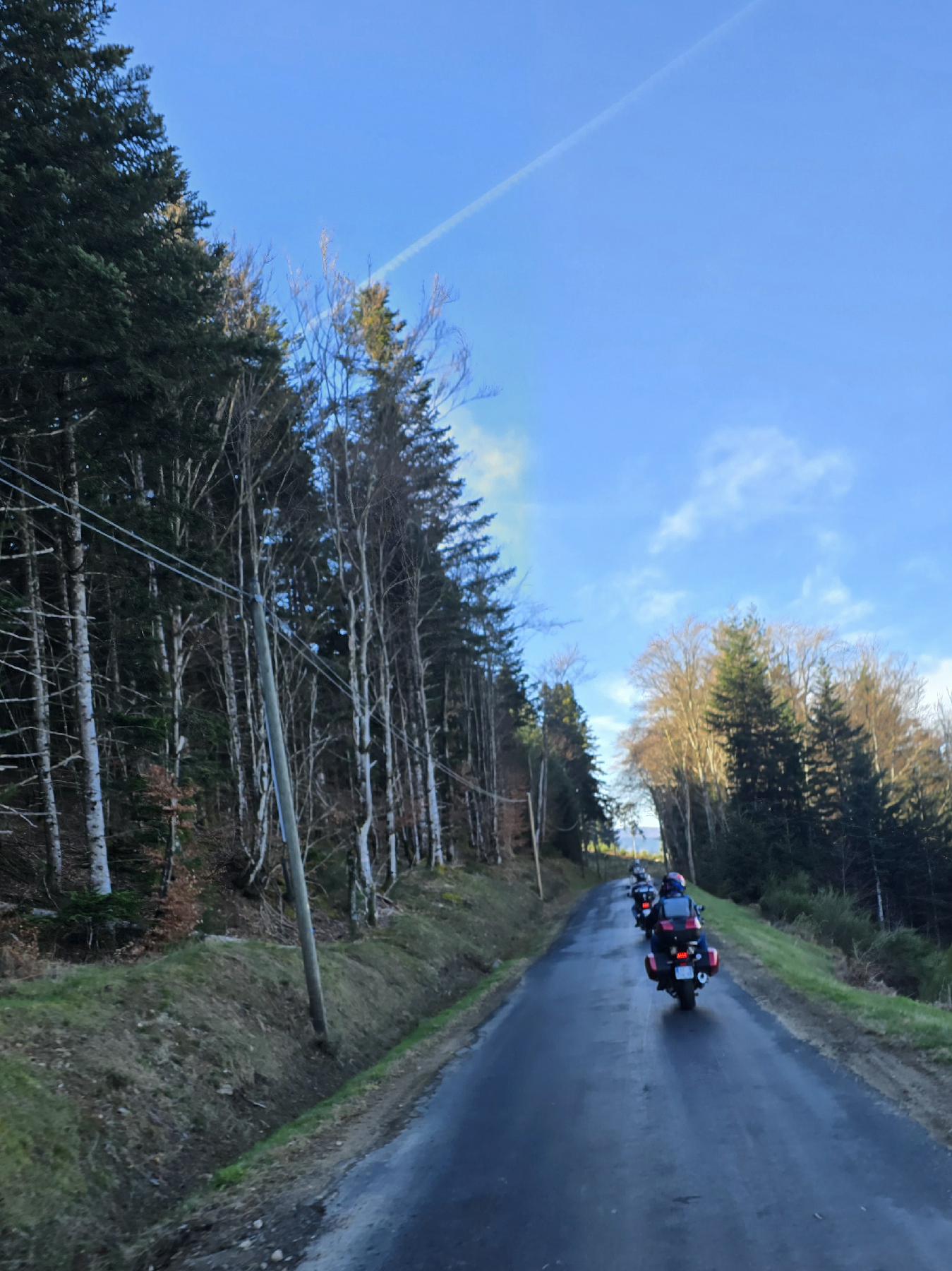 Petit café-croissant et à 9h30 les moteurs se mettent à chanter. Direction la route – la vraie – celle où l’horloge perd soudain tout pouvoir et où « encore une petite courbe » devient une unité de distance officielle.