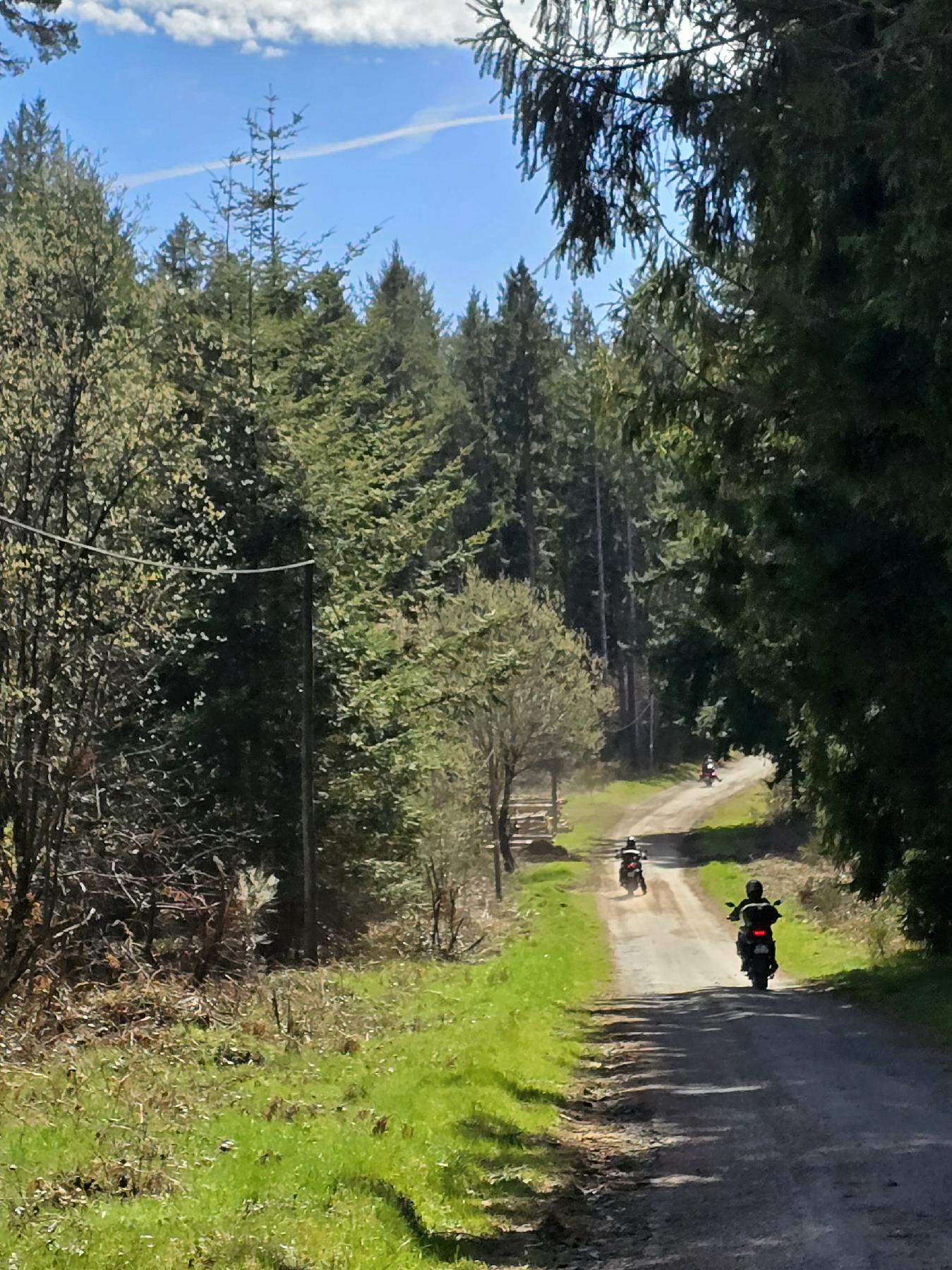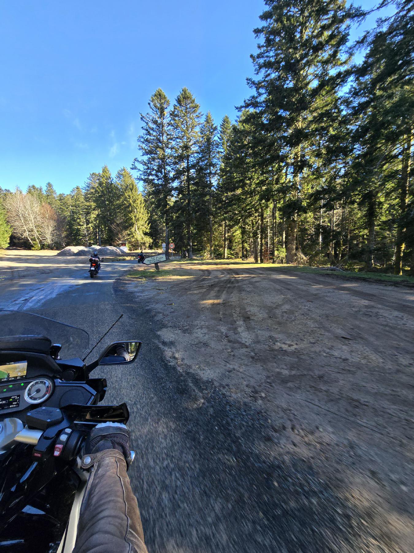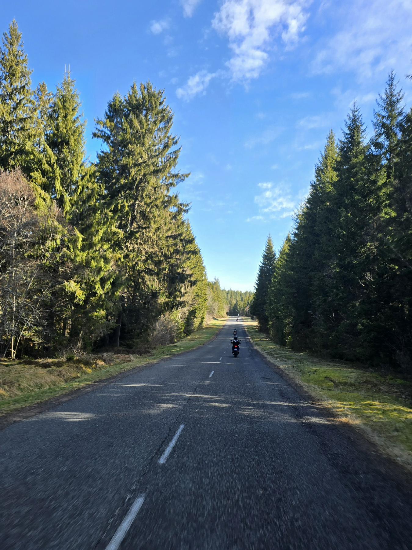 Petit café-croissant et à 9h30 les moteurs se mettent à chanter. Direction la route – la vraie – celle où l’horloge perd soudain tout pouvoir et où « encore une petite courbe » devient une unité de distance officielle.