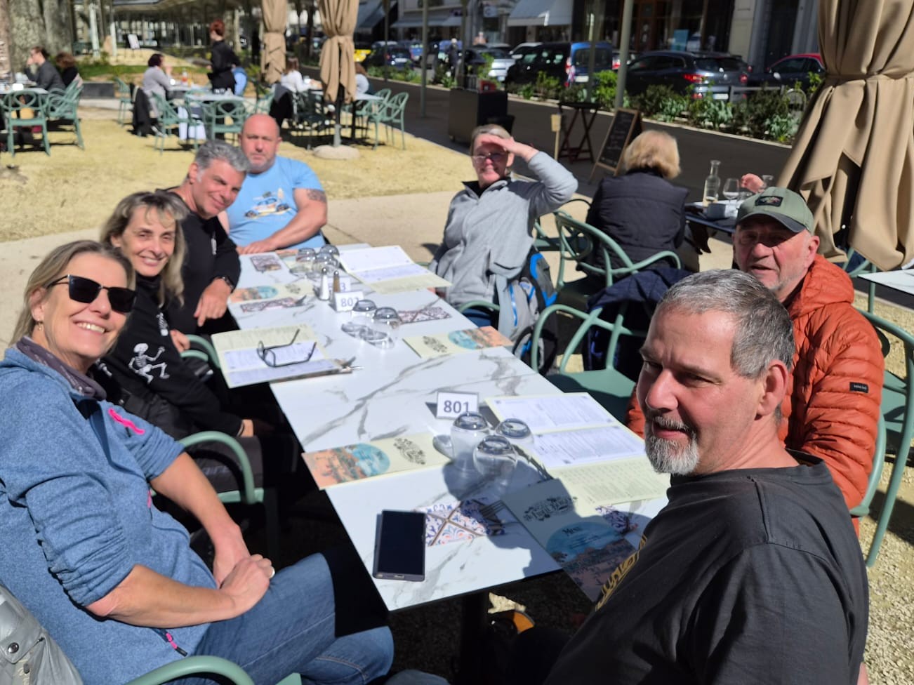 La fin de journée se conclut à la pizzeria du village. Apéro, puis forcément pizza… Sauf notre Jacques international qui se lance dans la « calzone ». Et ce n’est peut-être pas le choix le plus judicieux, car il est écrit à la carte : « Calzone à choix » ; autrement dit, tu choisis ta calzone en fonction des pizzas à la carte. Eh bien Jacques n’a rien compris ! Après maints échanges avec la patronne (l’heure tourne !), nous avons enfin pu passer commande : il était temps ! La prochaine fois c’est pizza pour tout le monde.